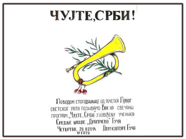 Средња школа „Драгачево“ је у четвртак 20. фебруара 2014. у Дому културе у Гучи програмом „Чујте, Срби!“ отпочела обележавање прославе стогодишњице од почетка Првог светског рата. У програму су учествовали велики број наших ученика, хор и рецитатори.